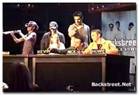 Boys: laughing and snickering. Nick: ...and uh, you don't want to hear the rest so.... they didn't taste too good...so go ahead on. Howie: I think I've tried the cooking thing to also.So um, then afterwards I took my car to the airport and watch like the planes take off...theres a .....uh, highway near the airport where you can actually pull over and watch the planes take off so thats was about it. Kevin: What'd you guys do while you were watching the planes take off? Nick: Yeah. What'd ya do Howie? Howie: We kinda just talked.. Guys start laughing. A.J.: Just talk. O.K. Kevin and all the rest of the guys look over at Brian. Kevin: Brian? Brian: What? Oh, my turn? I had a uh, highschool sweetheart at the time and I went to her school and broke in her locker and... yes, I broke in her locker... A.J.: rebellious? *I think that's what he said* Brian: Laughs. ..and I put a dozen roses in her locker and they had these little stick up note pads and I wrote little notes and messages to her and put some stuff on her antenna out on her car in the parking lot so... Nick: mockingly awwws. Brian: ....so little things like that. Just like a trail all the way out when she left school. Kevin: Did you get arrested? Brian: I didn't get arrested. I didn't get arrested for breaking in her locker.